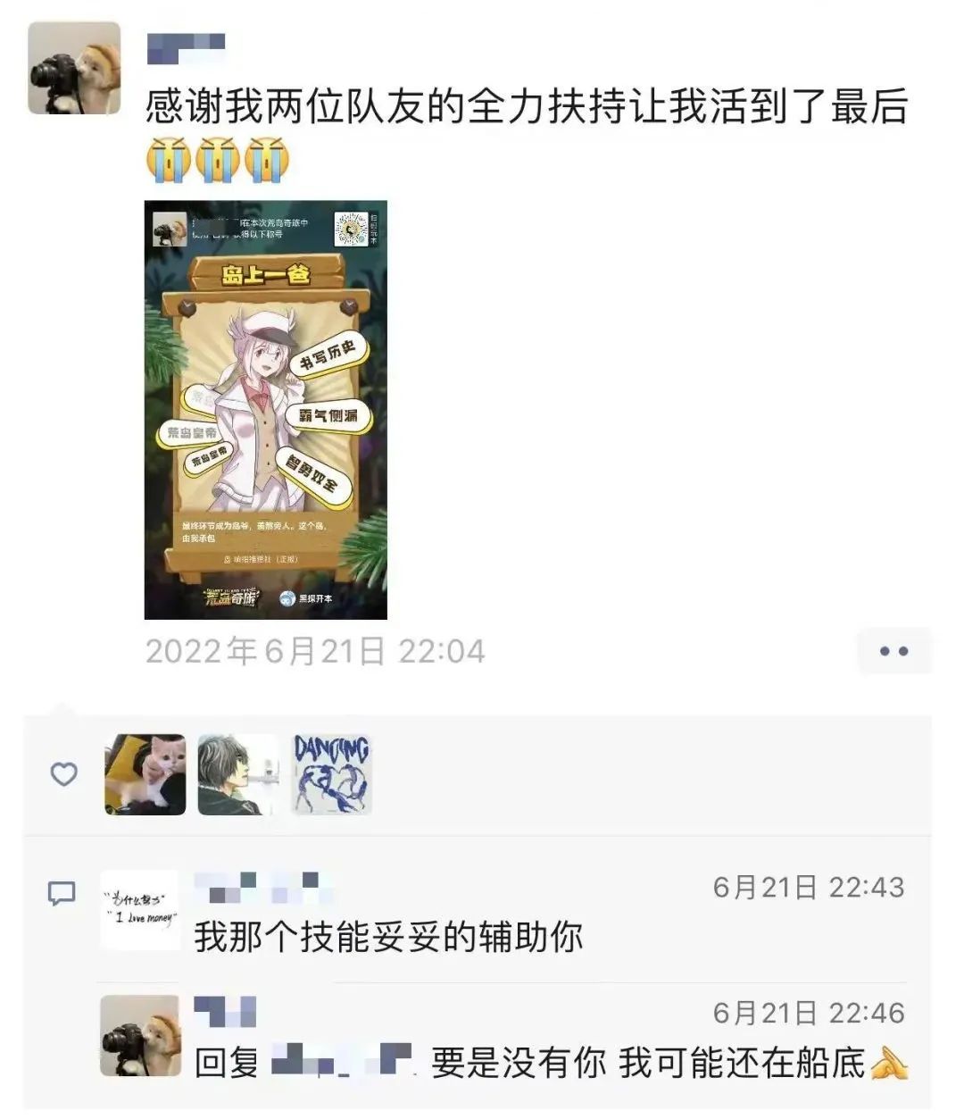 淮北十三档案:荒岛生存类的题材很新颖,机制也很吸引人,每一轮都要收集足够资源的设定,能让所有人都动起来,基本不会出现有玩家挂机的情况。而且岛奴的设定特别有意思,能玩得很开。