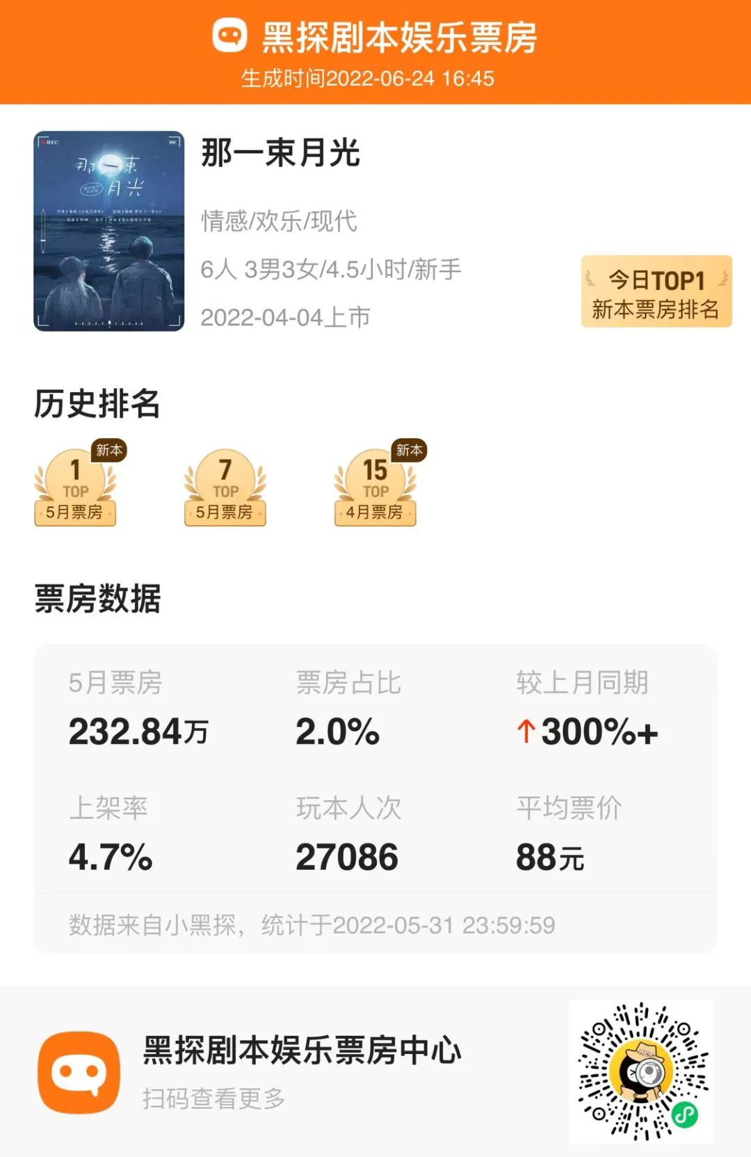 从5月份到6月份,这个剧本连续蝉联「黑探剧本娱乐票房」排行榜第一名。据黑探剧本娱乐票房中心显示,它5月票房为232.84万,当月玩本人次达27086人次;截至发文前,该本6月票房为158.25万,玩本人次达17934人次。