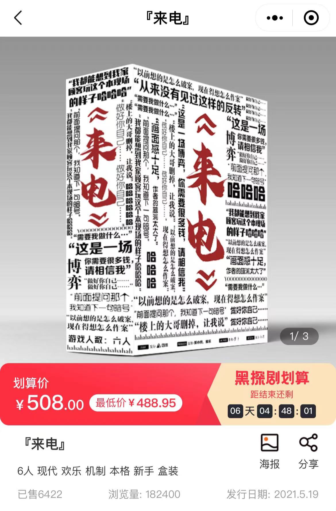 在黑探有品售出的历年剧本销量排行榜上,有这样一个销量夺冠并仅是去年才开始发行的黑马剧本。它的浏览量高达182400次,目前在平台上已经热销了6422盒,测评好评如潮,它就是“突然”冒出来的黑马——欢乐本《来电》。