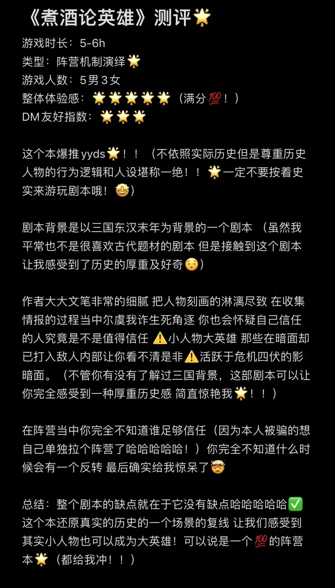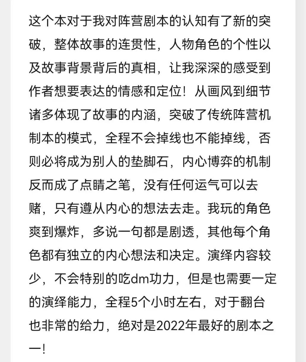 剧本亮点:1、机制精彩;2、故事精彩;3、沉浸感强。