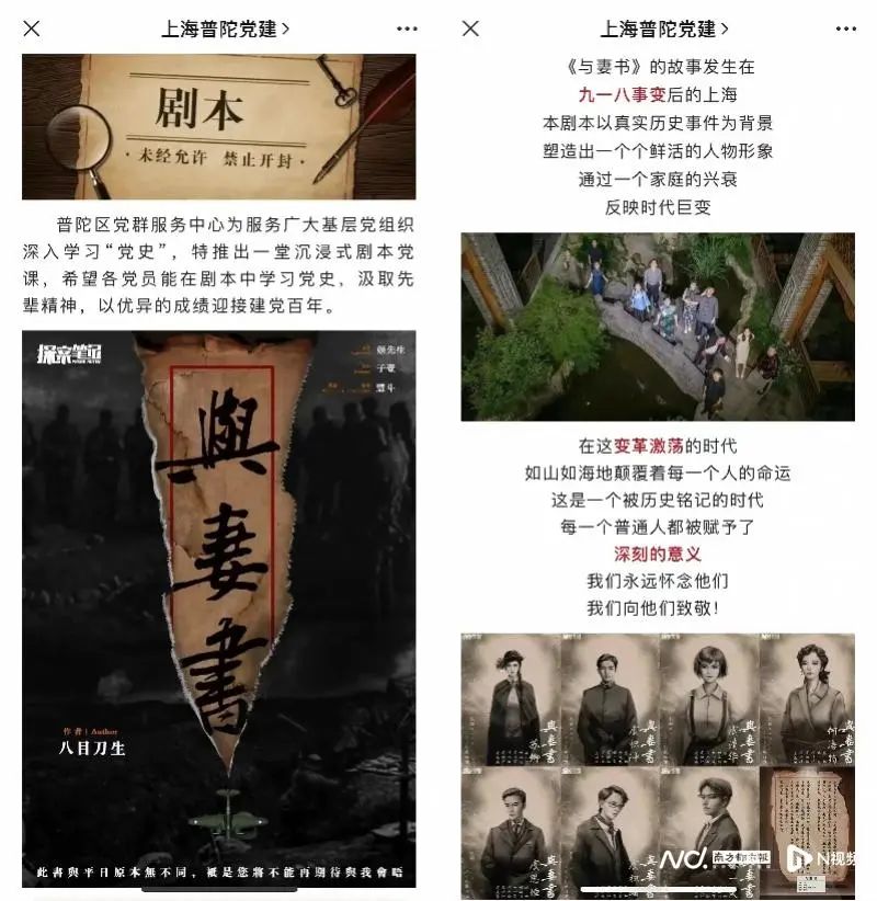 据孟玉洋透露,探案笔记是最早尝试将剧本娱乐作品和党建结合的企业之一。在2020年,探案笔记的红色剧本作品《与妻书》就被上海静安区的几十个党支部购买作为党建服务;随后,探案笔记还接受普陀区委托定制的党建剧本作品《光芒》;今年,建团100周年之际,探案笔记还接受地方团委委托制作了纪念建团100周年的红色剧本。