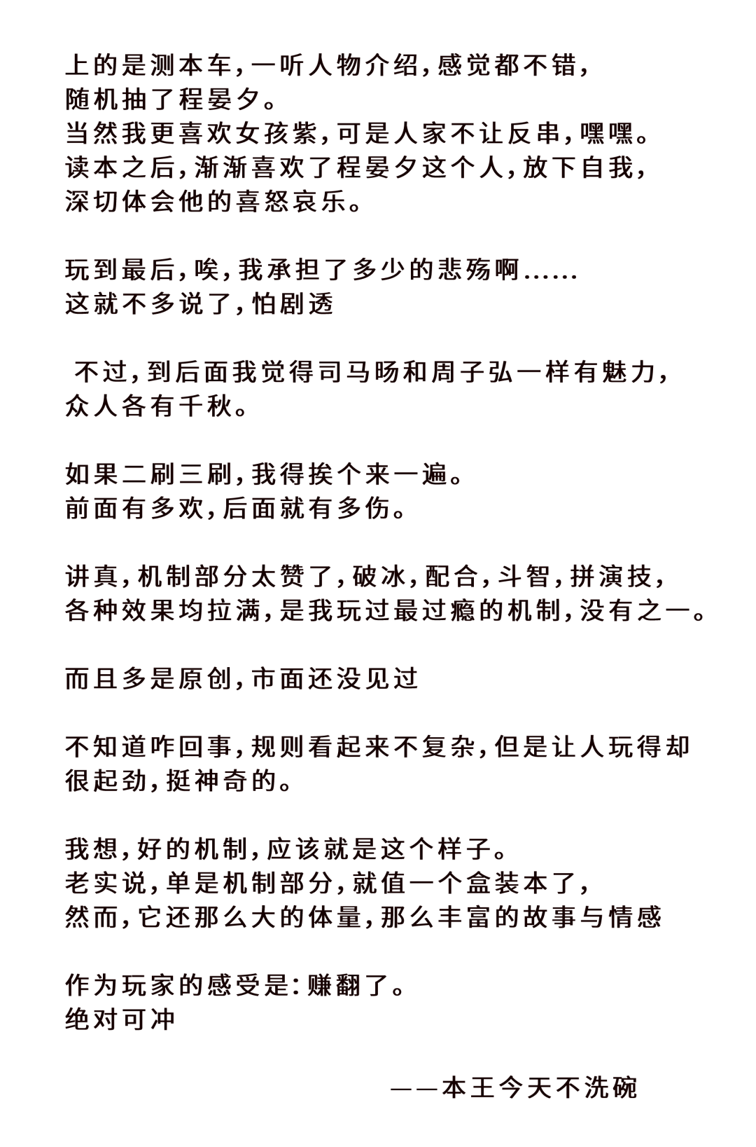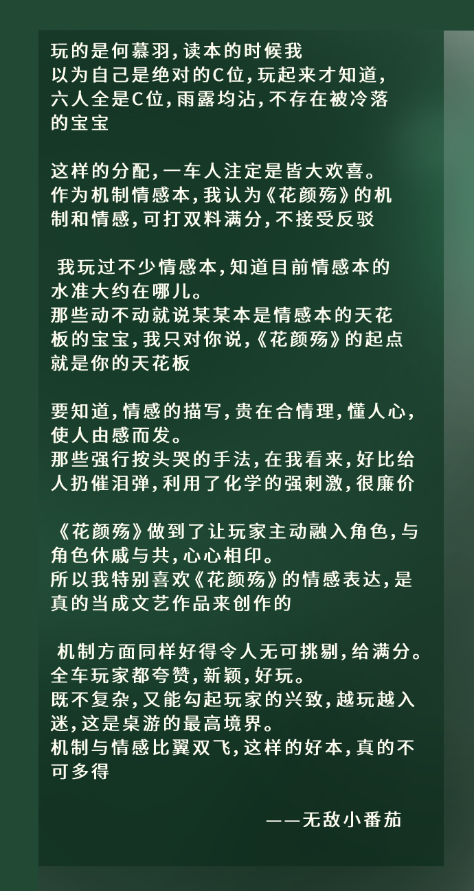 最后想说,这个本虽然新手可玩,但对玩家的阅读认真程度和共情能力,是有点要求的,否则未必有我所说的那种超赞的效果。