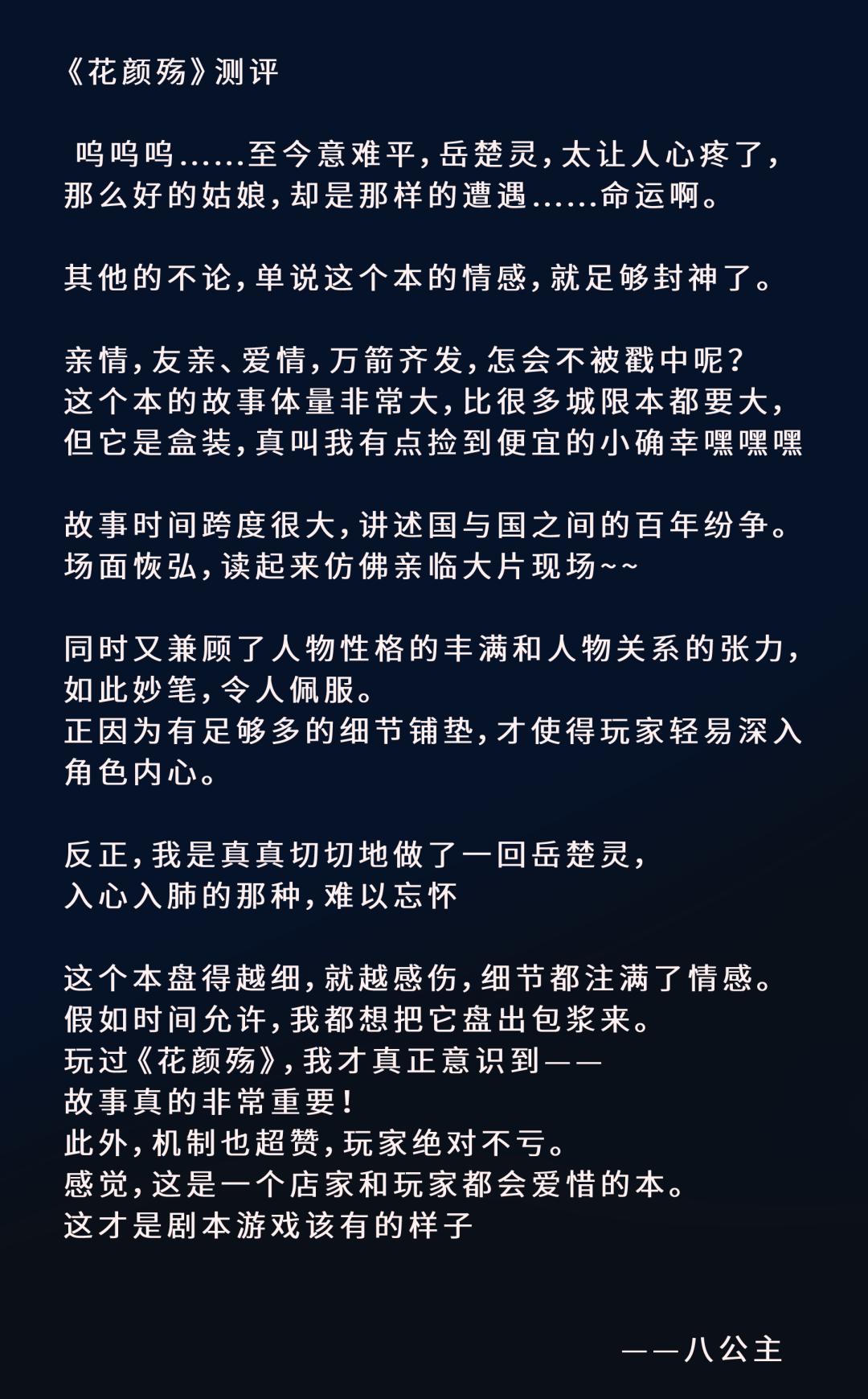 《花颜殇》的文笔凝练、细腻、传神,是剧本圈中不可多得的好文字。当然,这也需要玩家对文字有足够的敏感,才能品读出深层的好来。