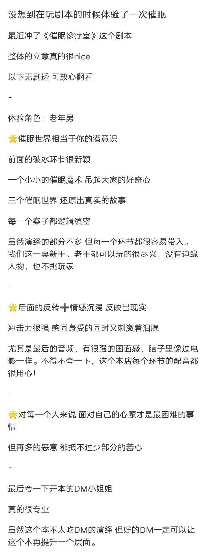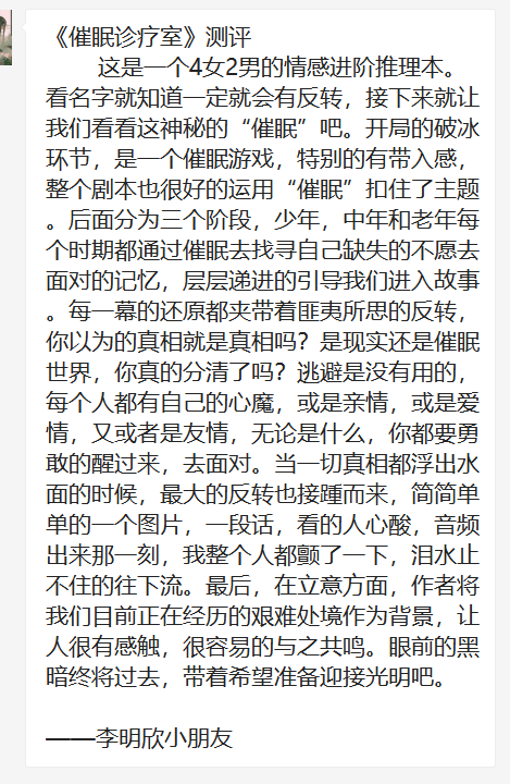 催眠,一个听起来古老又神秘的术法。 有人希望通过它忘记过去、逃避现实;有人希望它能唤醒自己沉睡的记忆。 每个人的成长路上总会不可避免地遇到一些磕磕碰碰。 如果可以被催眠,你希望它能够给你带来什么帮助? 在那么一处布置整洁,光线柔和的室内,你舒适地躺着。 站在你面前的,是一位催眠师,四周都十分安静,你能听到的只有他的声音。 在他的操控下,你渐渐陷入了自己的潜意识...... 本期新本速递,现代立意本《催眠诊疗室》来啦。 据说,催眠可以让人产生正常状态下不可能有的想法、念头和行为。 而当你的潜意识被唤醒,你还是你所认识的你吗? 《催眠诊疗室》 题材:现代 / 立意 / 本格 / 推理 工作室:火柴人剧创工作室 人数:6人(4女2男) 时长:4-4.5h 故事简介: 6位受邀的不速之客,5分钟催眠暗黑觉醒,3段旧时离奇死亡案,1位催眠师梦里追凶。 你活在现实世界里,不,你活在自我催眠的世界里,给我五分钟,让你真正醒来。 人物介绍: 【少年女】一个留着齐耳短发的女高中生。 【少年女】一个面容姣好、文静的长发女高中生。 【中年女】一个干练利索的家庭主妇。 【老年女】一个和蔼可亲的老婆婆。 【中年男】一个文质彬彬穿着西装的男人。 【老年男】一个拄着拐杖的老爷爷。 剧本短评: 硬核和情感结合得很好的一个本,适合喜欢情感的硬核玩家,也适合萌新。 开场有个独特的破冰机制——催眠破冰,后续才发现催眠贯穿了整个剧本,很好的扣了题。体量不是很大,但故事内容丰富饱满,每个人都藏着很多的故事,值得被发掘。 一共有三个案件,难度不大,细节很多很到位,每个推理步骤都能从剧本或线索卡的细节中找到逻辑证据,整体的盘凶不是很难,不会切断情感点的体验。 最后故事有反转,恰好是故事的升华,我们活得太过沉重压抑,好不容易有一束光照进来,当然要不顾一切死死抓住。 可这光离得近了,却又在我们和我们身边之人的背后投下新的浓重的阴影,要放手吗?重新随落进那深不见底的黑暗,与这时光一起被人遗忘? 抑或是,陨灭在那道光的温暖里,成为这时代里一暖而过的烟火? 那些我们不想面对的记忆如潮水袭来,瞬间淹没了所有希望,终究我们还是没有任何选择的余地。 硬核之外,无论是前期的沉浸,还是后期的情感爆发,都毫不突兀,直击人心,层层铺垫,步步渲染使得这个本玩完之后,所有情节依然都值得回味。 ——星城探案 《催眠诊疗室》 对于一个常年深夜emo的失眠少女,我一直都好奇催眠的心理治疗能不能有效的帮助我? 巧了,今天就玩的这个本子,光名字就深深的吸引了我,《催眠诊疗室》这是一个4女2男的情感推理立意本,开场的破冰游戏我就很喜欢,是一个催眠魔术,还有小游戏,一下子就把我们的气氛都调动起来了。 作为一个情感本玩家,这个本的推理环节真是把我难住了,尤其是第二章的那个推理环节,当我们费尽心思以为自己找到真相的时候,一个极限的反转让我瞠目结舌。 既然是催眠,有失忆和反转是想象得到的,但是作者的高明之处就在于,你明知有反转的情况下,结果出来那一刻,你还是会发自内心的翘起大拇指点赞。 前面艰难的推理完全没影响到我一个水龙头的沉浸,我玩的角色先不透露给你们,我只能说,当哆啦A梦出来那一刻,瞬间就破防了,泪如泉涌。 那句:我们重新认识一下吧,直接打到了我心里,以往的片段在眼前浮现,久久不能消散。 《催眠诊疗室》的立意非常的贴近现实,在如今这个困难的时期,我们要勇敢的对面困难,打败心魔,乐观的生活。感谢您来到催眠诊疗室,愿世间冷暖终被治愈! ——努努酱 你有尝试过在梦中追凶吗?当你被催眠时你敢正面反击内心的恐惧吗? 欢迎来到“催眠诊疗室”!这是一个剧情设定以催眠为主体的本子,在这个本里,你需要在梦境中破解谜题找到案件的凶手。 我玩的时候就有种盗梦空间的感觉,当一切真相浮出水面,那些被你深藏心底的人事物逐渐清晰,你是愿意留在梦里还是回到现实呢? 剧本前面的破冰环节有熟悉催眠须知、填写诊疗信息单、还有dm扮演的催眠师让我们做的催眠小游戏等等,这些都让催眠诊疗室这个本增添了很大亮点! 案件难度不大,但绝对让你过足了瘾,而且故事背景也都结合了我们现实正在经历或将要经历的事。 三桩案件也许表面上看起来没有关系,当我们一步一步拨开迷雾的时候就能看见案件背后错综复杂的关联。 剧本杀推理的神奇之处不就是让玩家带着热情和动力去解决看似简单实则复杂的各种凶案吗,催眠诊疗室既做到了神秘色彩浓厚的多重推理、又有让我不失热情的极致还原、最后的情感沉浸无疑是剧本最大的反转与亮点! 我可以说我是哭惨了,明明不是情感本,也没有按头哭,但偏偏直击人心,剧本的立意还需你们自己去体会,很喜欢dm说的一句话:愿世间冷暖终被治愈!喜欢新颖剧本的玩家不能错过! ——正经剧本杀 作者采访: 铜豌豆 Q:创作该本的灵感或来源是什么? A:这是我写作的第一个剧本,我之前是影视编剧,疫情期间在家隔离,觉得心理压力很大,也觉得失去自由是种身体的煎熬,所以我想创作一个剧本。 因为从事影视工作原因,《催眠诊疗室》这个本子的切入点的灵感来自于电影《催眠大师》,故事的时空设定灵感来自于电影《盗梦空间》,剧本的结构则像黑泽明的电影《罗生门》。 当然,这些都只是灵感的出发点,而不是全部,整个