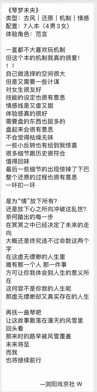总结:这个本确实触动到我了,是我打过最有感情的机制本,是我打过机制最好玩的还原本,是我打过还原最有意思的情感本。本的名字也很点题,关于“琴”、关于“梦”、关于那些遗憾的“未央”。用两句话总结一下读完故事的感想吧:“我屠了一座城,守了一世情,只为了找到你”、“这辈子除了你,宁愿去死,也不愿与任何人相许”。