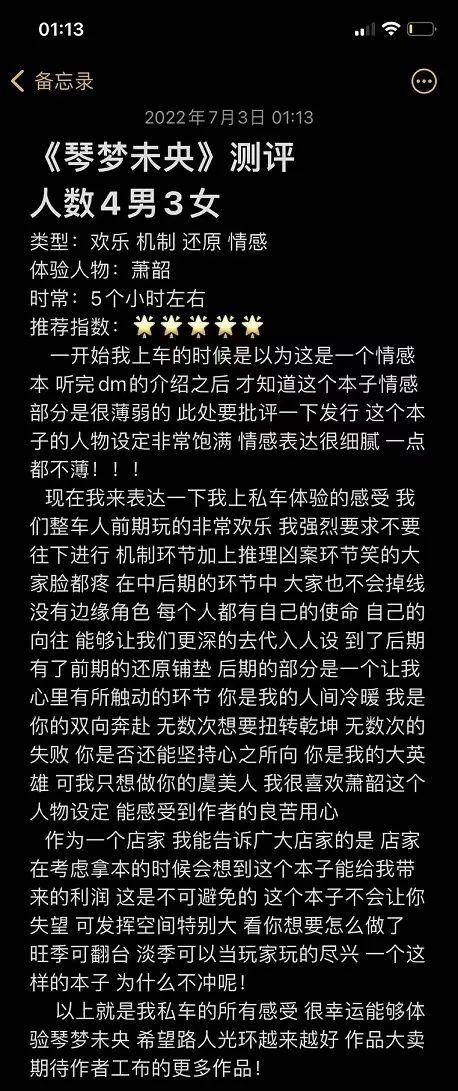 丝滑的推理、高强的还原、刺激的机制、细腻的情感,以及大家的种种选择,就构成了这个完整的故事。这个剧本的受众群体非常广,是一个非常适合拿回去开的本子,我相信各位店家拿回去是一定可以赚钱的。质量是真的很高。每个人物都有着为之不同的故事,也会有每个人不同的选择。至于如何选择,获得怎样的结局,那就看诸君心中所念了。