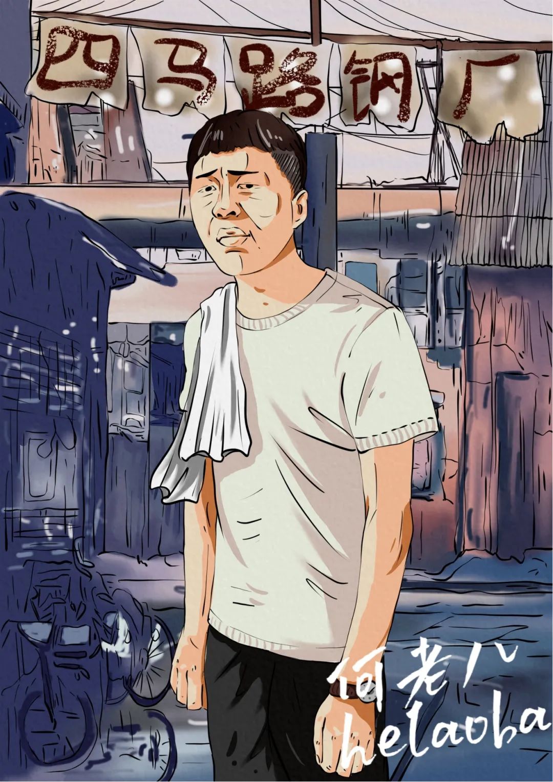【何老八】男,中年,身材瘦弱,四马路著名街溜子,身穿自带BUff的白色T恤,一张不算丑陋的脸上永远愤世嫉俗。