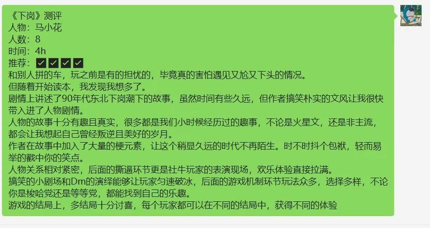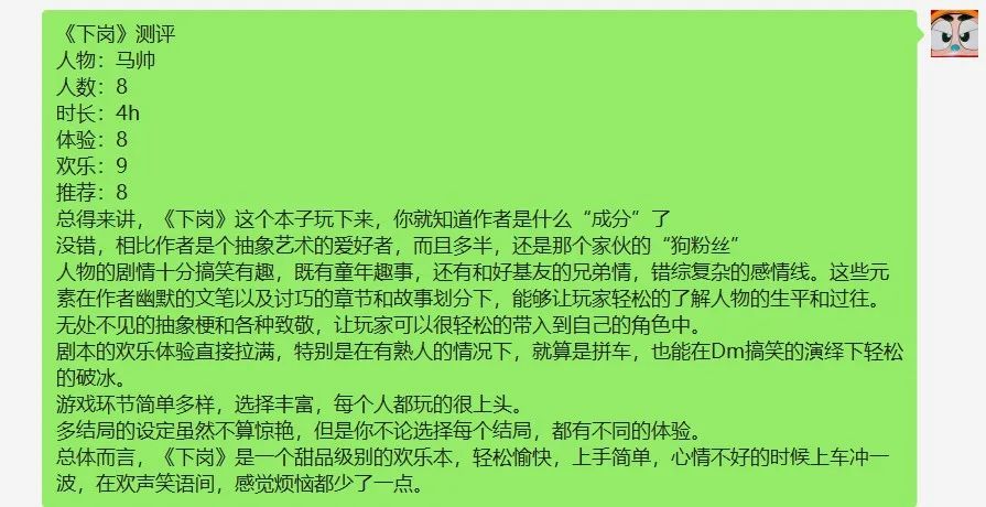 虽然本子的名字叫《下岗》,但是整个剧本游玩下来,你会发现作者一直在给玩家一个正能量的引导。在这个特殊时期玩上一次,在我看来,心中多多少少,都会增加一丝面对未来的勇气和信念吧!