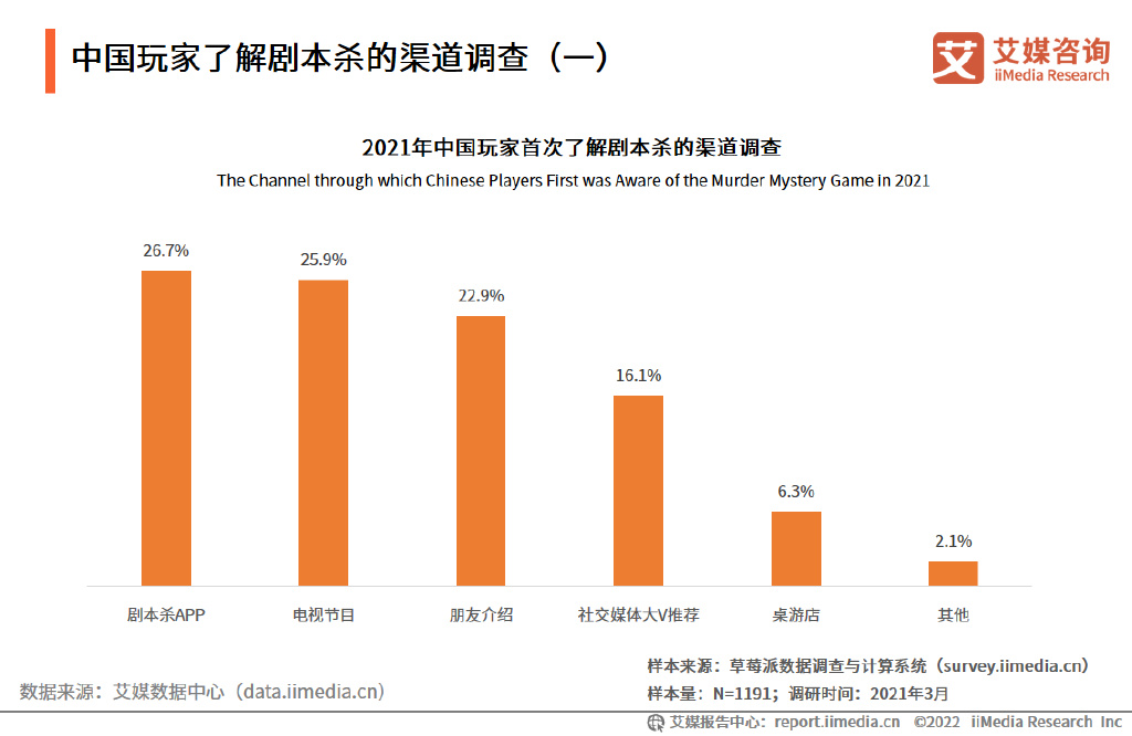 数据显示,2021年,中国受访玩家首次了解到剧本杀的渠道主要是剧本杀APP,占比26.7%,如剧本杀、百变大侦探、我是谜等;其次是电视节目,占比25.9%,诸如《明星大侦探》等。艾媒咨询分析师认为,剧本杀通过线上APP与相关综艺节目“出圈”,并成功吸引玩家或观众到线下剧本杀门店消费。