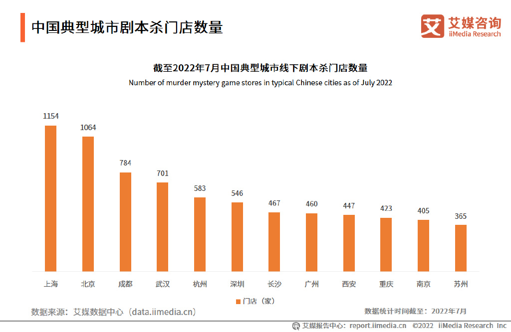 数据显示,截至2022年7月,上海剧本杀门店数量超过1000家,高于北京、深圳和广州,此外,典型的网红城市如成都,剧本杀门店数量近800家。艾媒咨询分析师认为,经济实力排名靠前的城市,城市居民的生活和工作节奏比较快,压力指数也比较高,对于剧本杀等沉浸式重体验的游戏的需求会更高。而成都、武汉等地将剧本杀与文旅结合发展,也带动了当地剧本杀门店数量的增长。