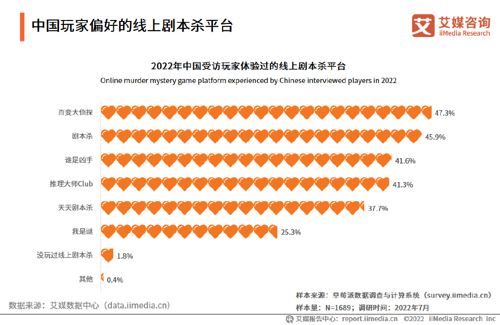 数据显示,2022年《百变大侦探》《剧本杀》《谁是凶手》《推理大师club》是受访网民使用最多的四个线上剧本杀平台,使用度均超过四成。艾媒咨询分析师认为,线上剧本杀有突破时空界限的优势,但用户付费意愿较低,线上剧本杀平台单靠付费剧本显然难以获利。因而拓宽平台收入来源、走通线上商业模式是线上剧本杀商家亟待解决的问题。