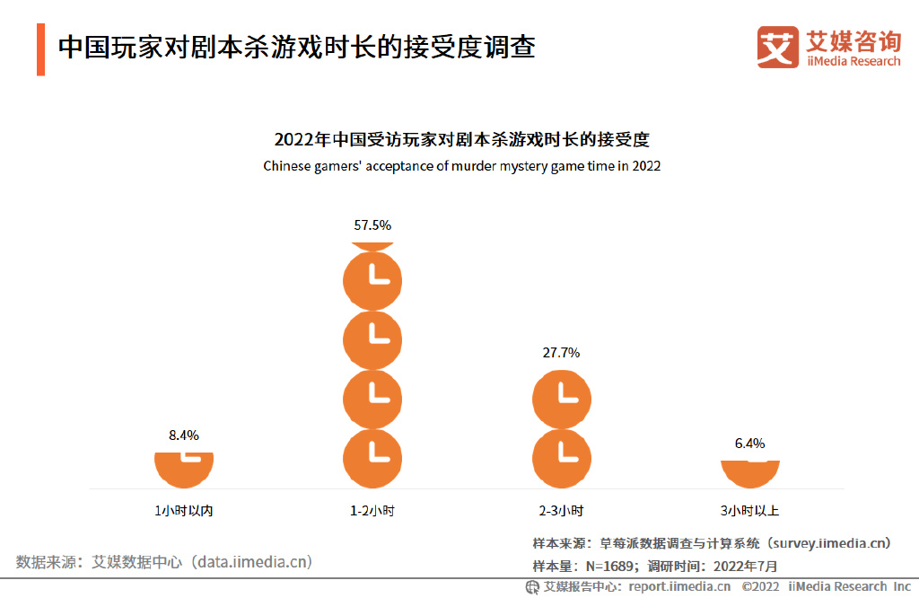 数据显示,2022年,57.5%的受访玩家认为每局剧本杀游戏的时长控制在1-2小时为最佳,27.7%的受访玩家则认为2-3小时的游戏体验会更优。艾媒咨询分析师认为,剧本杀的游戏时长除了与剧本长度、剧情复杂程度有关之外,主持人对于游戏节奏的把控也是影响时长的重要因素。目前剧本杀行业中还没有一套完整的主持人培训规范,导致业内主持人水平参差不齐。建立完善的主持人培训体系有助于大幅提升玩家的游戏体验,这也将是剧本杀行业发展的关键因素。