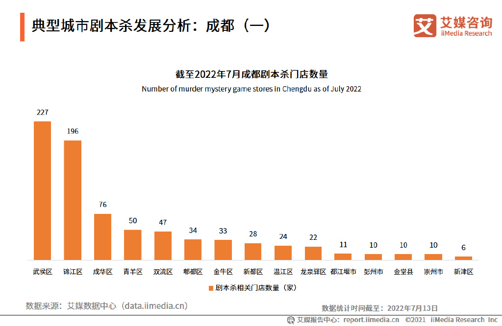 截至2022年7月,成都共拥有784家剧本杀门店,其中武侯区、锦江区的剧本杀门店最多,分别为227家及196家,主要开设在科华北路、高新技术产业开发园、春熙路等人口密集的商业中心,剧本杀线下店布局格外密集。以春熙路为例,周边已开设92家剧本杀线下店,分布在太古里、王府井等地,其中沉浸式推理,桌游等形式推理剧本最受欢迎,连锁店预约火爆。