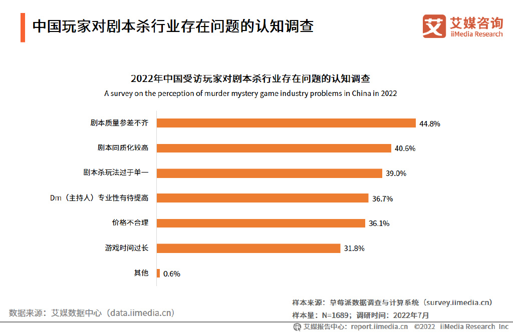 调查显示,2022年,目前中国网友对于剧本杀行业的存在问题认知主要集中在剧本上,剧本的质量参差不齐、同质化程度高以及玩法单一是网民认为剧本杀行业需要改进的地方。此外,36.7%网民认为剧本杀的主持人专业程度也有待提高。艾媒咨询分析师认为,剧本杀的上游目前缺乏对剧本质量的标准化检验,只能通过业内开展展会、交流会等形式对剧本的质量进行检验。未来,剧本质量的有效检验流程以及主持人的职业化培训都是剧本杀行业发展的重要保障。