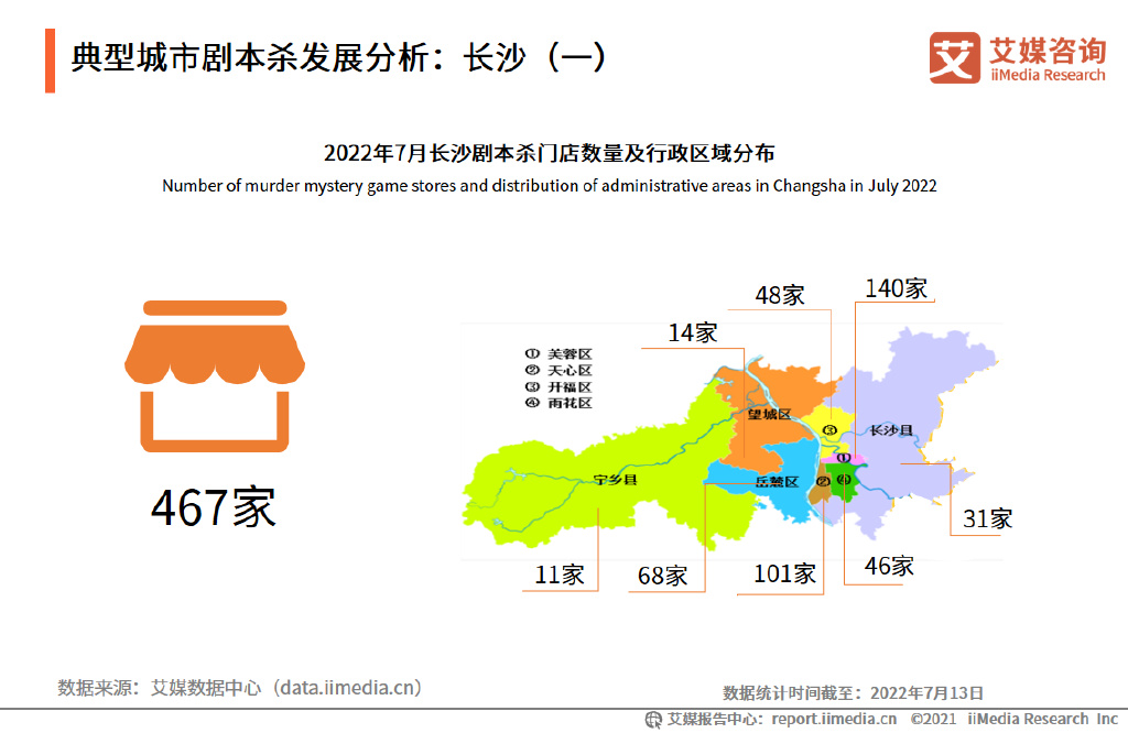 截至2022年7月,长沙共拥有467家剧本杀门店,其中芙蓉区、天心区的剧本杀门店最多,分别为140家和101家。以芙蓉区为例,芙蓉区地处湖南省的政治、经济、文化、商贸、信息中心,浓缩了中国城市发展历程,聚集了彰显长沙历史文化底蕴的相当大一部分精华,考古发现、名人住宅、历史街巷遍布其中。