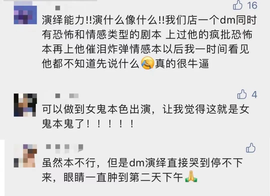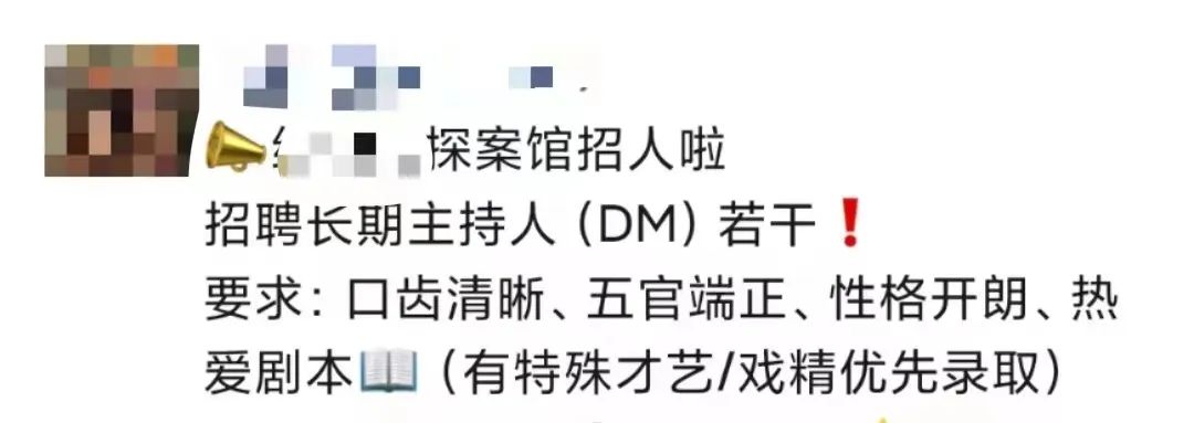 最近看到了一则关于剧本杀DM的新闻——上海戏剧学院表演系学生成为剧本杀主持人。 新闻中所说的主人公帅帅,是上海戏剧学院表演系一名大三的学生。他表示自己从2019年底开始接触到剧本杀,并在之后的两年里,利用周末时间到剧本杀店里做兼职DM。 这也说明,有越来越多不同领域的人愿意去尝试和了解剧本杀这个行业。 这是好事。平时在朋友圈冲浪的时候,也会经常刷到一些招聘剧本杀DM的信息。 招聘信息里的条件和要求只多不少: 改本能力要过硬、演绎能力得在线、熬夜能力一级棒、应对各种下头事件还能面带微笑、还得有会拯救本子能力...等等。 剧本杀DM的门槛,真的如外界所想的那般低吗? 当一个好的DM,到底需要具备哪些能力? 今天就来唠唠:现在的DM们到底有多卷? 一 演绎能力 在之前的推送中,我们发起过聊一聊话题:《DM最让你叹服的能力是什么?》 那一条推文的留言区,出现了蛮多为DM演绎能力疯狂打Call的评论。 现在的部分剧本为了更好地表现故事,也让玩家能更快地进入角色,往往会在游戏中加入一些小剧场和演绎环节。 我在脑海中仔细地搜罗了一些玩过的剧本,最后想起了至今都让我惊喜的一段DM精彩演绎: 某次在玩本时,蓝牙音箱里播放着十分应景的BGM,我们围坐在一起对着线索卡苦苦思索。 那是一个分幕剧本,当时正在进入的是古风沉浸阶段。 “叮铃铃...”突然一声刺耳的手机铃声打破了现场的气氛。 我们面面相觑,心想,是谁这么破坏气氛不把手机关静音! 一抬头,才发现那是DM的手机响了… 虽然不满,但我们都没有说什么。 只听DM说了一句不好意思,随手接起了电话,说了几句我们当时在场的人都没有在意的话。 我们都天真地以为,那是DM的私人电话,可后来才发现,这居然是剧本中的一个情节设定! DM举止自然的演绎,没有让我们起疑,甚至瞒天过海,一度让我们以为就是一个玩本事故。 在后续的情节推进中,我们才意识到这个电话里隐藏着很多的线索。 这种演绎手法让我十分惊喜,以致于后来打本再遇到DM手机响了的情况,我都会格外留心... 关于DM的演绎能力,相信大家都是有目共睹的: 他们擅长模仿各种各样的声音,有着异于常人的代入感,而且说起谎来脸不红心不跳。 关键还演什么像什么,甚至还能面不改色地进行各种社牛互动,就不用我多举什么例子了吧。 二 再创作能力 如果你简单地以为,DM只是发本念复盘的工具人,那你可能只是看到了表象。 在某次展会中,我通过DM朋友小C了解到,许多DM有“捧着本子自己啃,才有信心给玩家开本”的习惯。 他们往往会在开本之前,就把剧本吃透,用自己的逻辑与方式把整个故事串起来。 甚至,还会自己搜寻一些合适的BGM穿插到其中,而不是简单地背诵主持人手册。 只有先把剧本内容了解透彻,才能确保在开本的时候,玩家问什么就能回答什么,再腾出精力灵活地应对各种现场的突发情况。 而有些时候,DM还会按捺不住自己的编剧能力,往剧本中添加一些属于自己的理解。 前两天我们采访了一位DM朋友:“你们什么时候会对一个剧本进行再创作?” 朋友回答说:“当觉得这个剧本的某些机制或情节不符合自己店里玩家需求的时候。” 还简单地给我们举了个例子: 比如剧本里某两个人物的关系,明明八竿子都打不着,但你的隐藏任务却写着:请找出你跟他的关系。 恰巧我就遇过一个类似的本子,我们最后把它改成一个布告栏的形式,通过找出自己和布告栏上人物的关系,你就可以获得相应的奖励或线索。 这样可以让剧本的机制和情节更加地完整,也大大地提升了玩家的体验感。 每一个剧本,不同的DM对它会有着自己不同的看法和开法,最终呈现出来的效果也不尽相同。 一个开本技术成熟的DM,甚至会在每一次开本的过程中,默默地听取玩家们的反馈和建议... 最后逐渐地往剧本里增加总结出来的经验,拯救普通本,升华优秀本,开出自己的特色。 三 “熬夜能力” “剧本人,不仅不配拥有睡眠,还总能看见清晨的日出和吃到刚出炉的早餐。” 这看似略带夸张和调侃的话,在刚接触剧本杀的时候并没有过分关注和在意。 但后来才意识到:“剧本人,没有睡眠”这句话,不是在开玩笑。 特别是对于DM来说,你永远都分不清他们朋友圈分享的饭是早饭还是午饭。 某推理馆的主持人告诉我们,一般全职DM的上下班时间,是下午1点上班,下班时间不固定。 往往凌晨2、3点了,都可能还在店里忙碌带本的事情,这是一个很常见的现象。 而且很多时候,DM还得兼顾搞卫生。 他还表示,辛苦不辛苦大家心里都知道,但为了给到玩家们最好的剧本体验,付出再多都是值得的。于是,熬夜成了DM的常态。