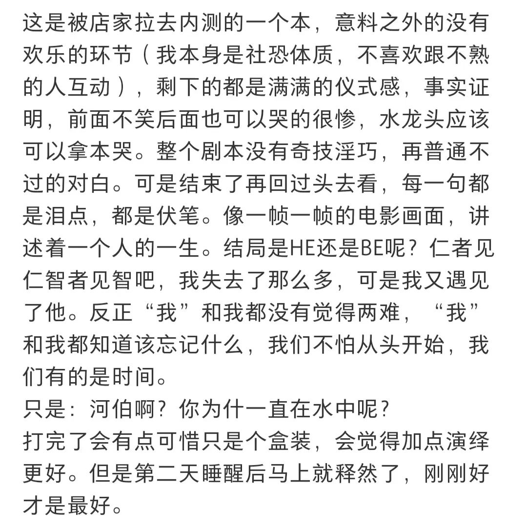 A:因为这个本子没有欢乐部分(希望店家把仪式感做足),以至于很多水龙头玩家第二幕就开始哭,我们家DM说真做到了“拿本就哭”。