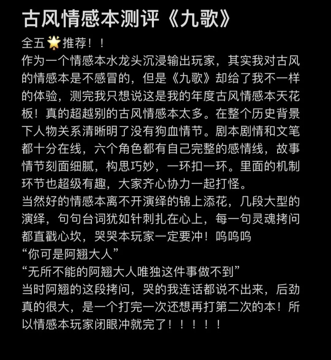作为一个情感本水龙头沉浸输出玩家,其实我对古风的情感本是不感冒的,但是《九歌》却给了我不一样的体验。