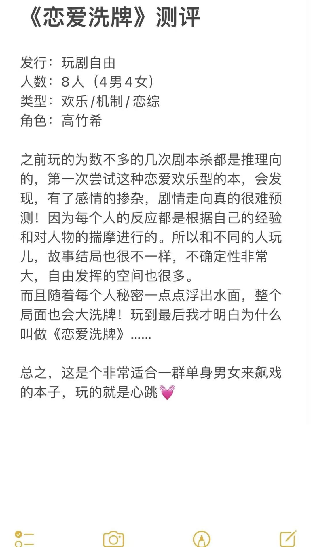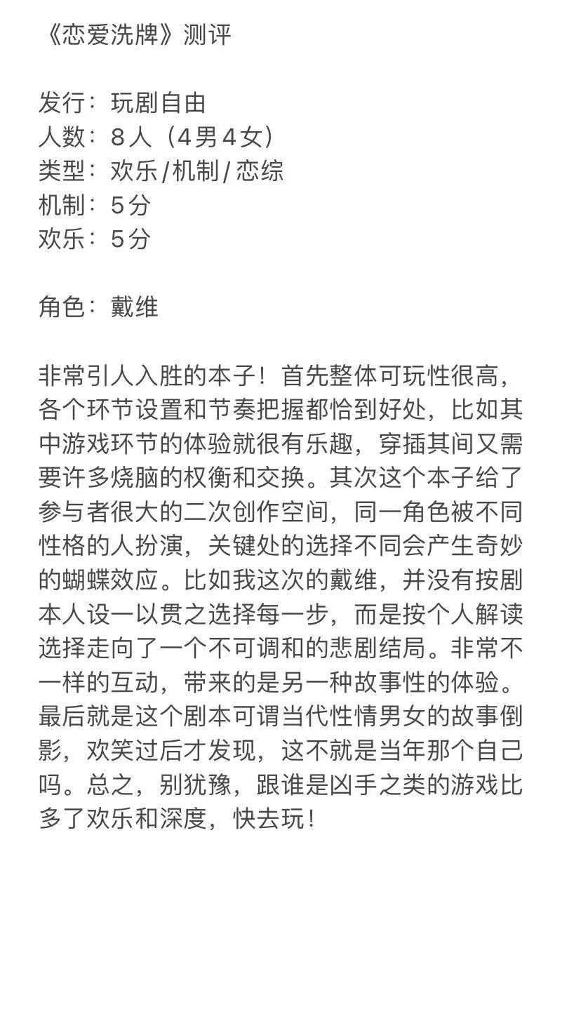 可以带暧昧对象来玩,顺便观察对方对本里每个人的评价,非常暴露价值观。建议就是最后环节可以引导,各自的游戏目的不一样会有很大的差异。