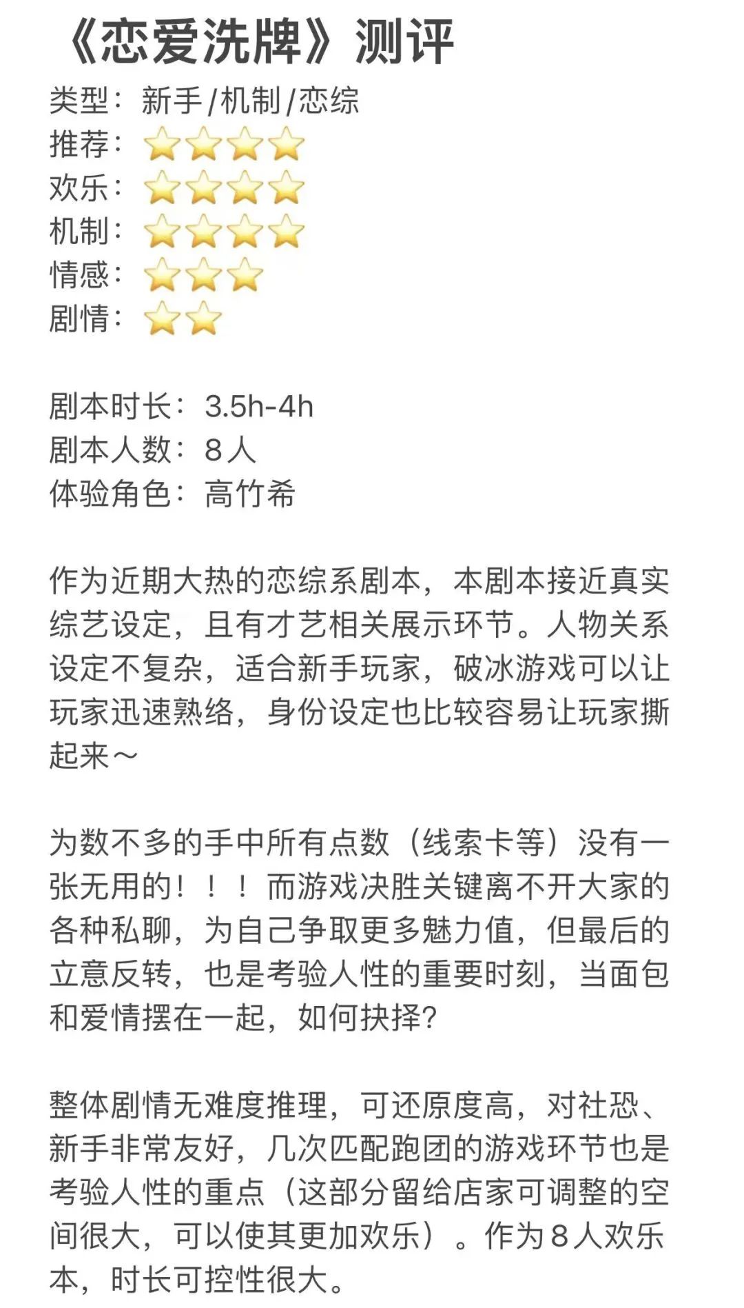 机制里没有觉得坐牢的环节,如果约会环节cp之间能获得一些共享的信息可能思考量会更大。总之是全程体验感非常好的盒装欢乐机制本。