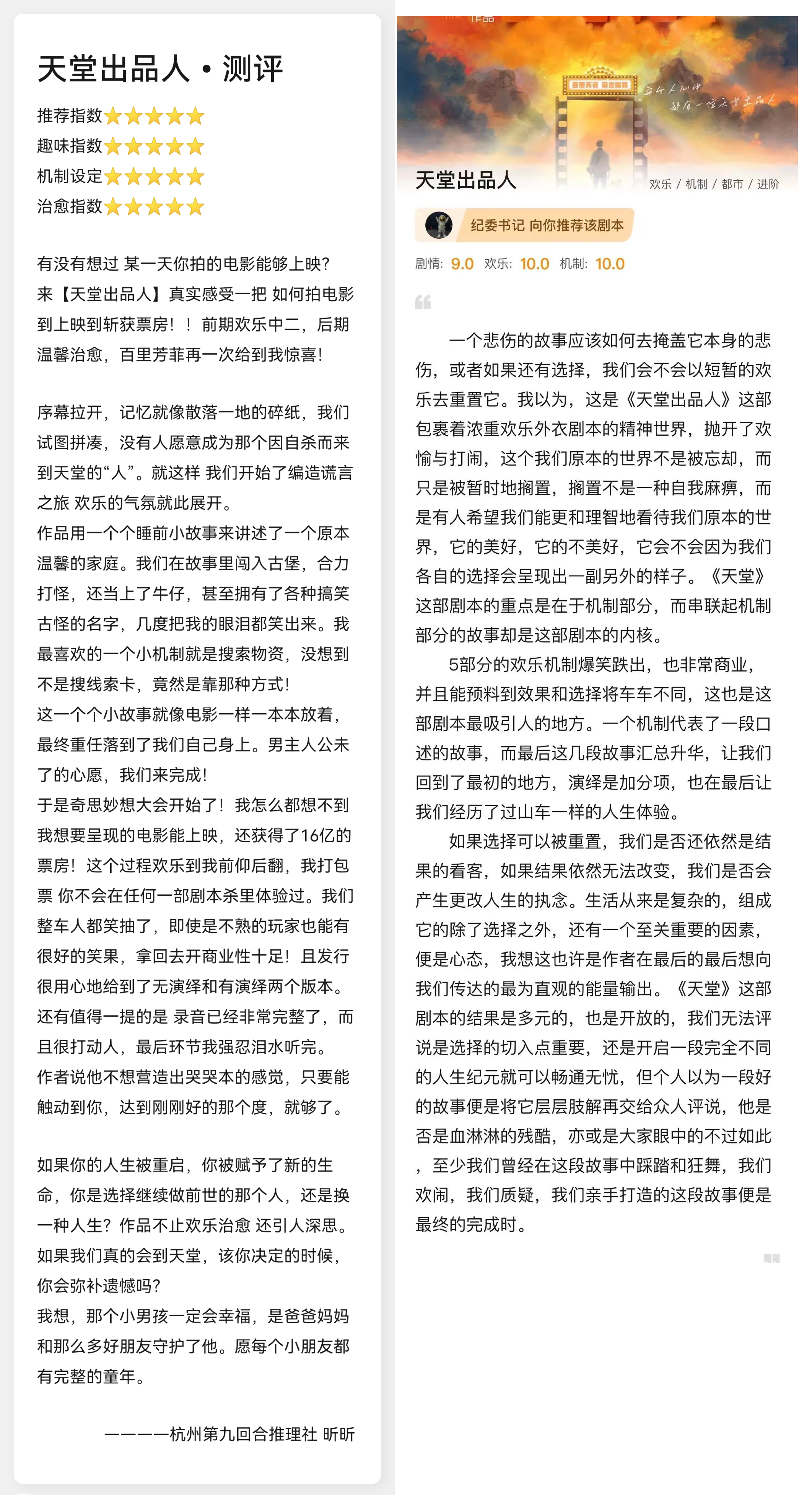 推荐理由:《天堂出品人》全程单dm,商业性价比很高,基本不会吃差评的本,前期欢乐机制,后期情感治愈的本,不是哭哭本!