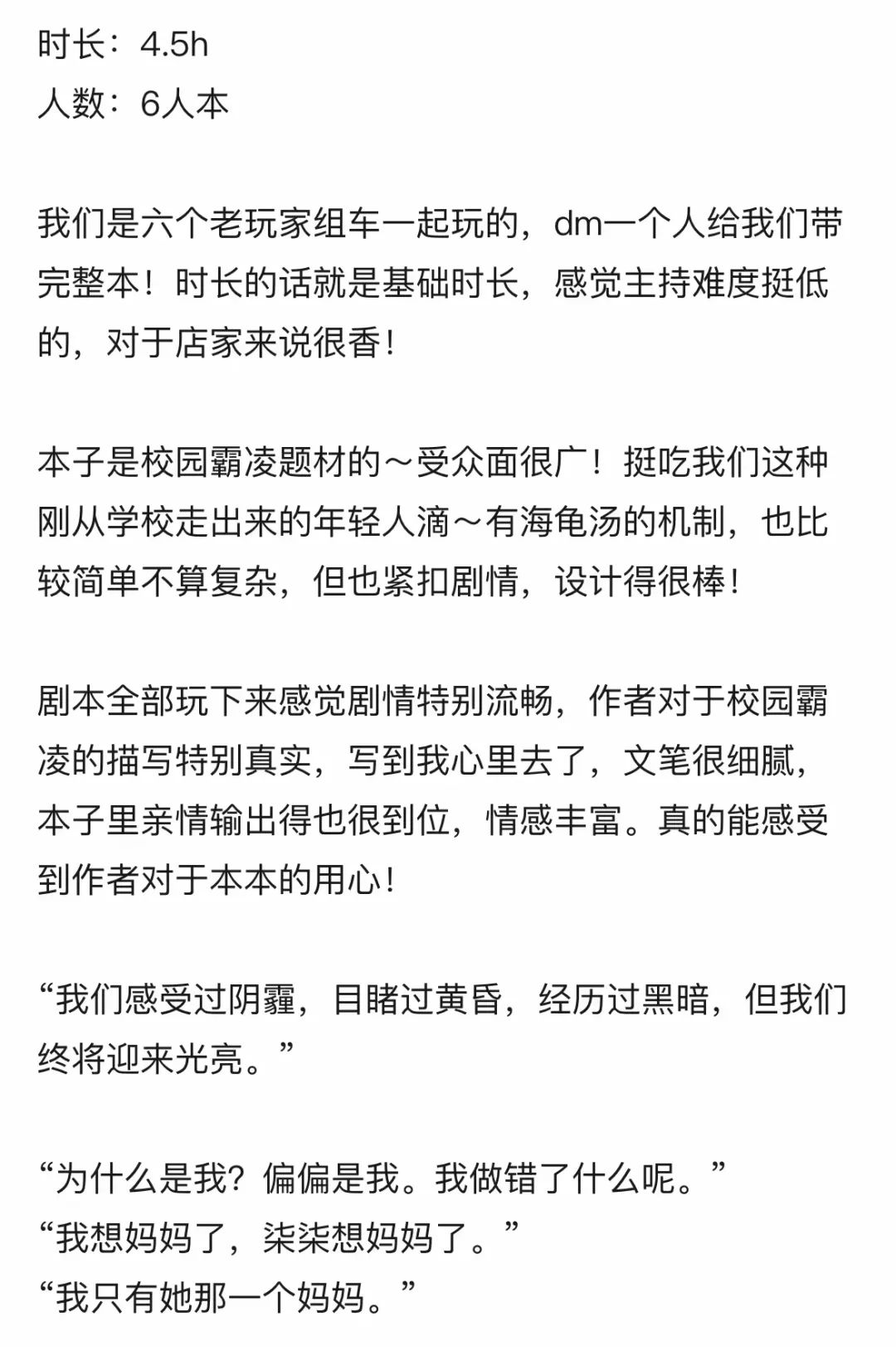 剧本全部玩下来感觉剧情特别流畅,作者对于校园霸凌的描写特别真实,写到我心里去了,文笔很细腻,本子里亲情输出得也很到位,情感丰富。真的能感受到作者对于本本的用心!