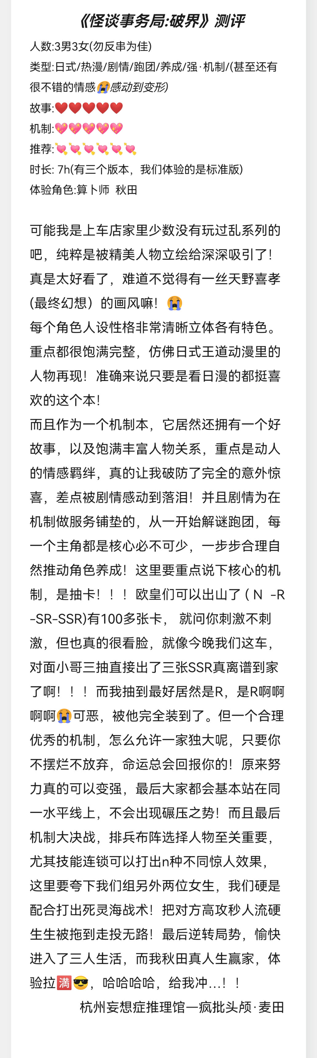 从“乱”系列入坑百川家的机制本,这次有幸上了《怪谈事务所:破界》撕扯,并见到作者本尊,和大家一起体验了一次纯粹的机制盛宴。