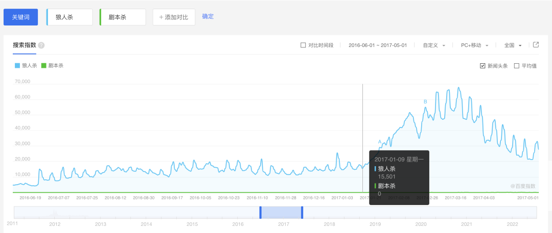 在百度指数上搜索,发现2016下半年狼人杀日均在新闻端被提及两万余次,并在2017年开年热度开始飞升。