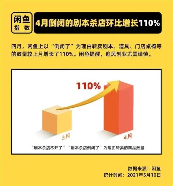 同期,闲鱼上以“倒闭了”为理由转卖剧本、道具、门店桌椅等剧本杀商品的数量较上月增长了110%。