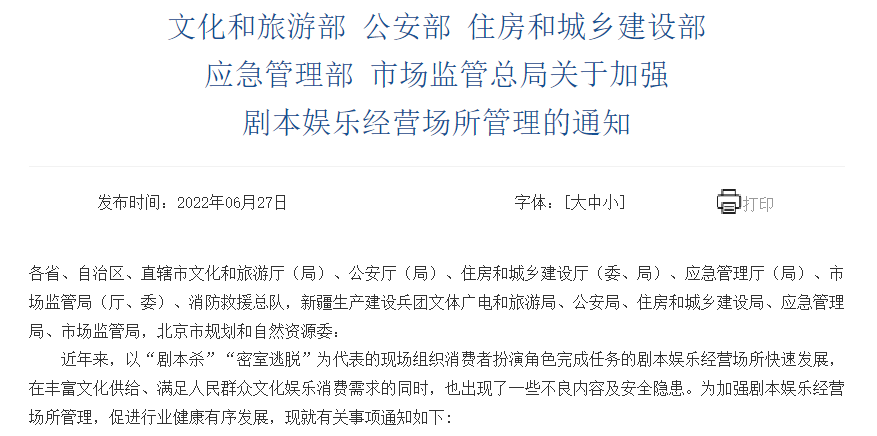 6月27日,文化和旅游部、公安部、住房和城乡建设部、应急管理部、市场监管总局五部门联合发布了《关于加强剧本娱乐经营场所管理的通知》。