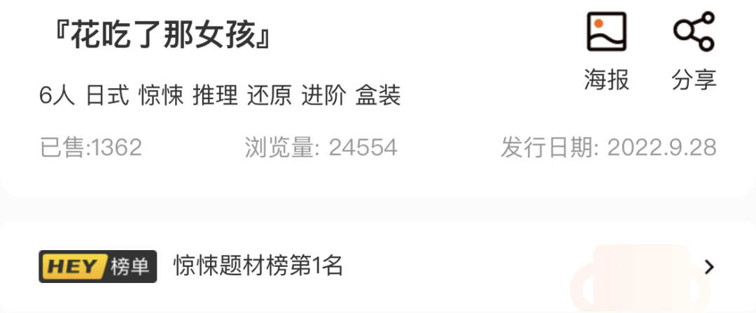 今年,限定本在市场上的热度颇高。 所以我们推荐的限定剧本也比以往多了许多。 而本期的「好本推荐」,终于难得是一个盒装本了。 它就是由脑力觉醒工作室与神隐六处工作室共同创作并发售的——《花吃了那女孩》。 截止发文前,该本在「黑探有品」成交量为1361单,商品浏览量累计达24554次,在惊悚题材榜上排名第一。 同时在上周,它也占据了「黑探剧本娱乐票房」一周排行TOP8,和美团“近期飙升”剧本排行榜TOP1的位置。 成为了今年继《告别诗》之后,另一个颇具热度的盒装剧本。 这个剧本的名字本身,从一开始就带来无尽的悬念和疑问: “花能吃人?花为什么吃了那女孩?是什么花?” 而从剧本的封面和人物海报上,也能够很容易地看出其中夹杂着十分厚重的日式推理色彩。 这个盒装本到底值不值得一玩? 今天就让我们一起来看看吧。