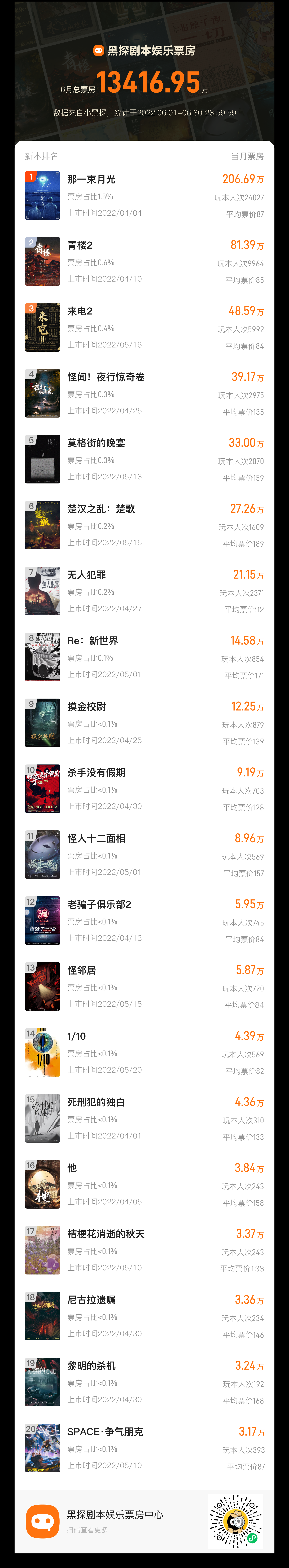 以下是6月新本票房TOP20详情。