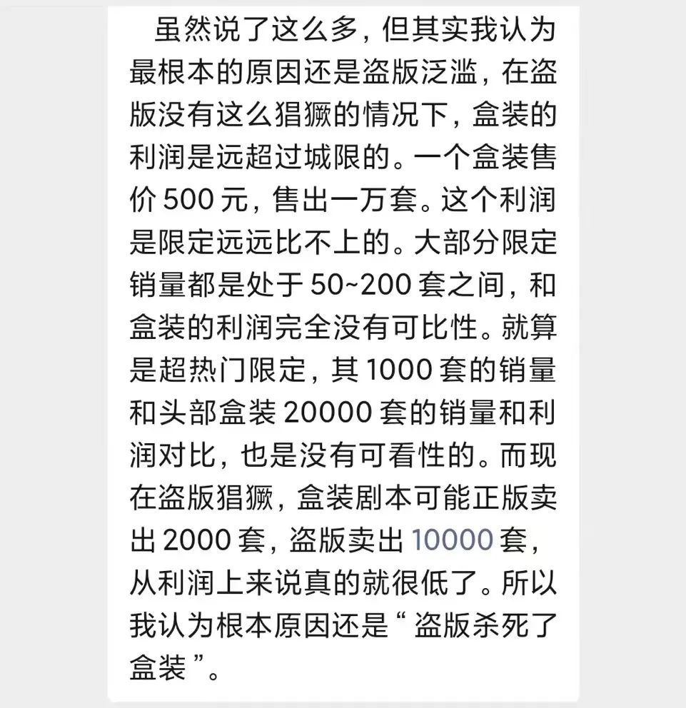 他表示:“盒装的正版保护实在是太难做了,一个火热的盒装剧本的销量很可能远远低于盗版。